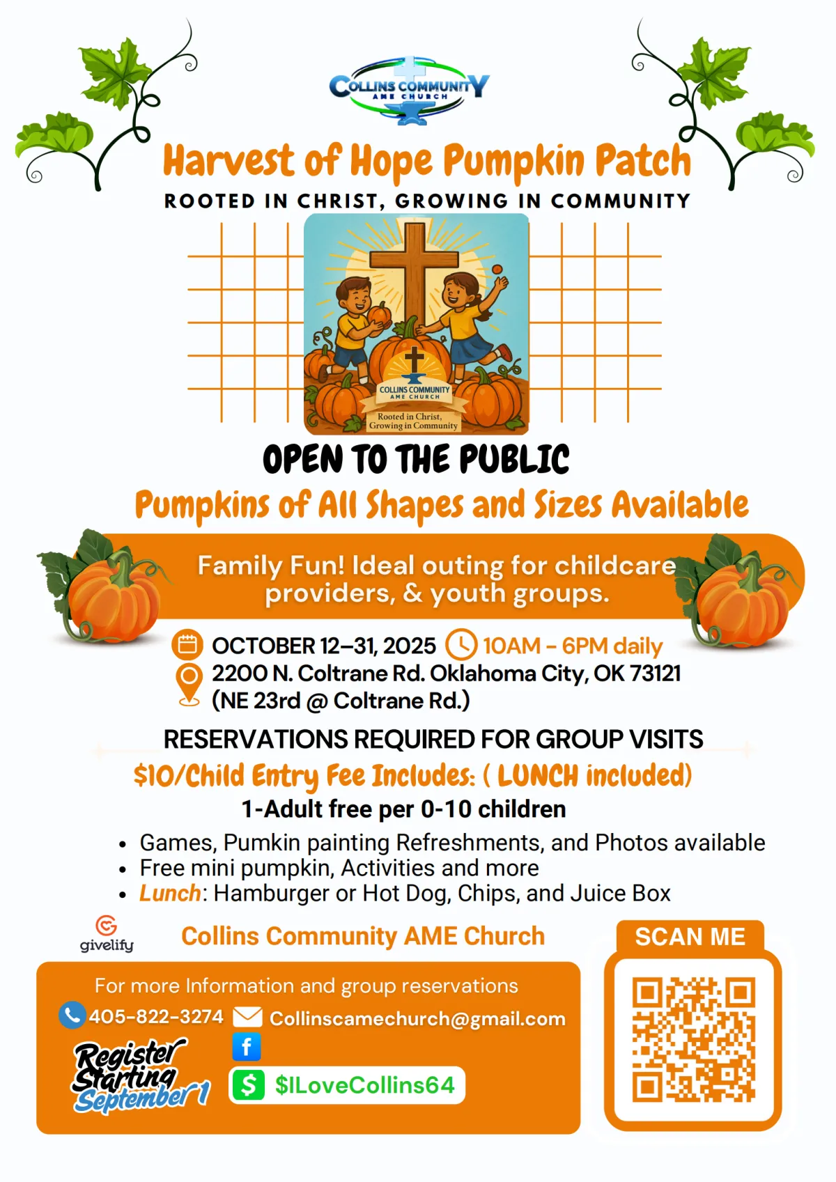 Daycares, Home School Groups, and Residential Facilities are invited to schedule a visit to the Pumpkin Patch by contacting the church office.